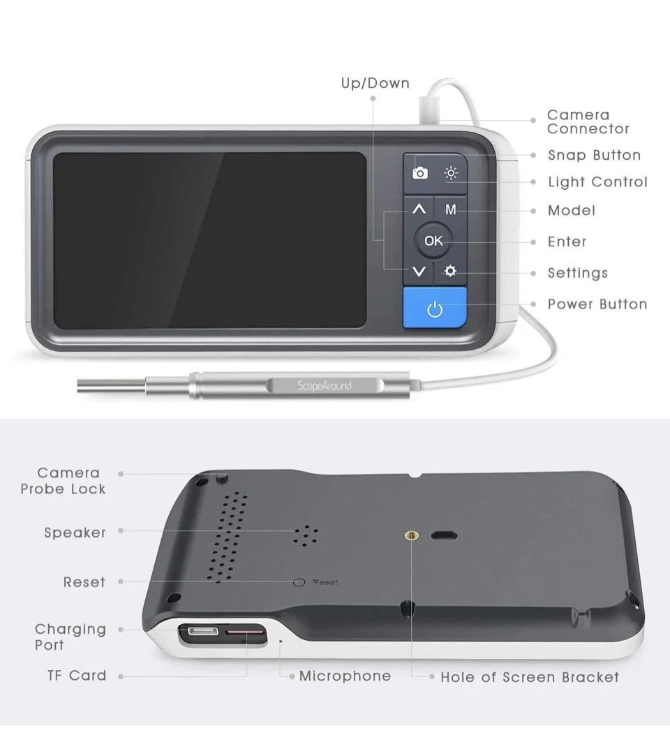 Package Contents - 4.5-inch Monitor, 3.9mm ear scope wax removal camera probe, Detachable Bracket (stand), user manual, 3x specula, 4x ear spoons ( 2 for adult, 2 for children), USB charging cable (charger NOT included).